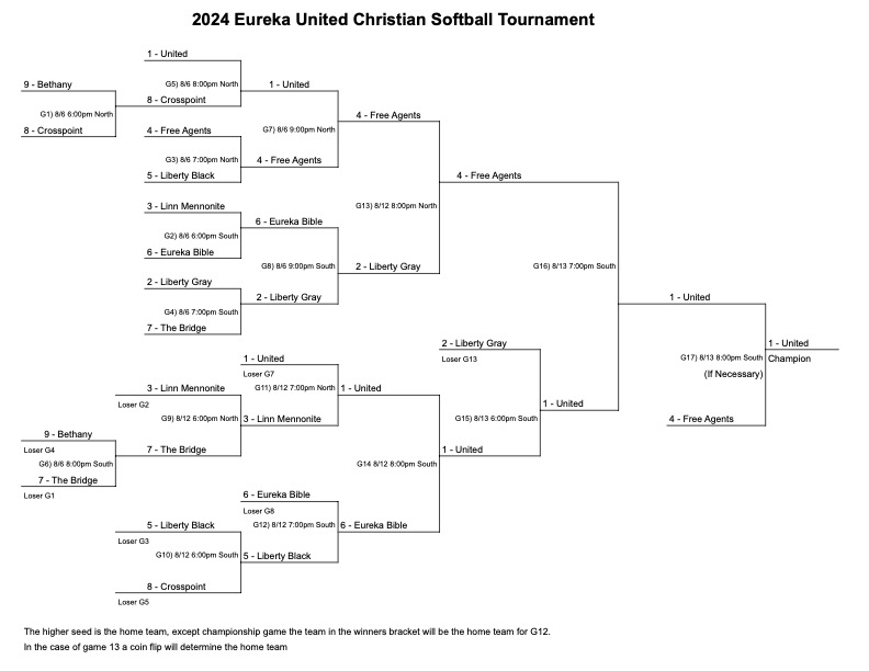 July 28Liberty Black 7 vs Liberty Gray 6Liberty Gray 6 vs Liberty Black 5July 21United 9 vs Eureka Bible 0Eureka Bible 8 vs United 15The Bridge 13 vs Bethany Community 3Bethany Community 5 vs The Bridge 17Free Agents 12 vs Crosspoint 5Crosspoint 5 vs Free Agents 11